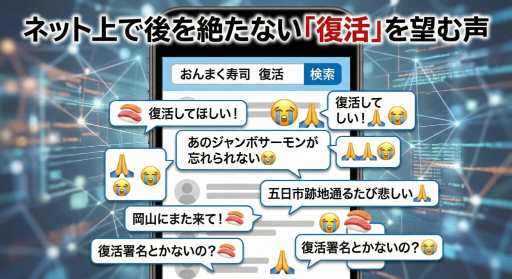 閉店から数年が経過した2025年現在でも、X(旧Twitter)やGoogleの検索候補には、おんまく寿司に関連して**「復活」**というキーワードが現れることがあります。