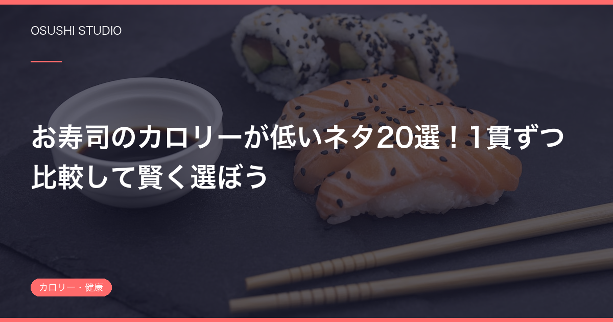 まずは結論から、カロリーが低いお寿司のネタをランキングで一覧にしました。ここでの数値は、握り寿司1貫(シャリ約20g+ネタ)あたりのカロリーです。シャリ部分のカロリーは約32kcalで共通のため、ネタそのもののカロリーが低いほど1貫あたりの総カロリーも下がります。