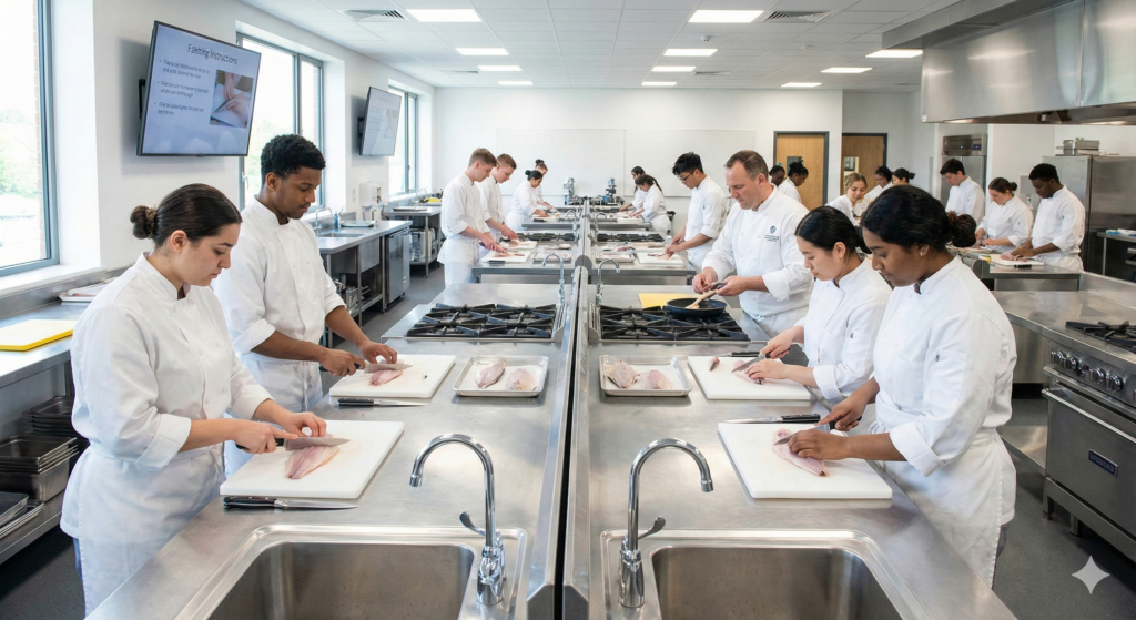 近年増えている寿司専門の学校では、包丁の使い方、魚の知識、衛生管理など、修行で数年かけて学ぶ基礎を数ヶ月〜1年で集中的に習得できます。
